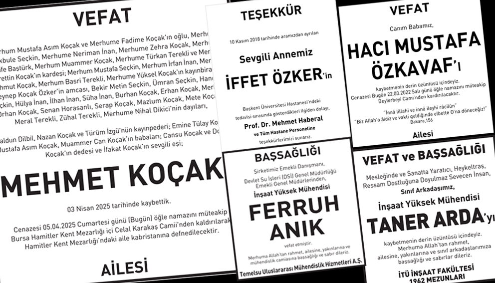 Vefat, başsağlığı, teşekkür, anma ilanları, sosyal ilanlar, ticari ilanlar, duyuru ilanları, resmi ilanlar, seri ilanlar eleman, kayıp, ilanları vb. ilanlar. Sözcü, Hürriyet ve diğer tüm gazetelerin 33 yıldır yetkili reklam ajansıyız, arayarak bizden fiyat ve her konuda destek alabilirsiniz.